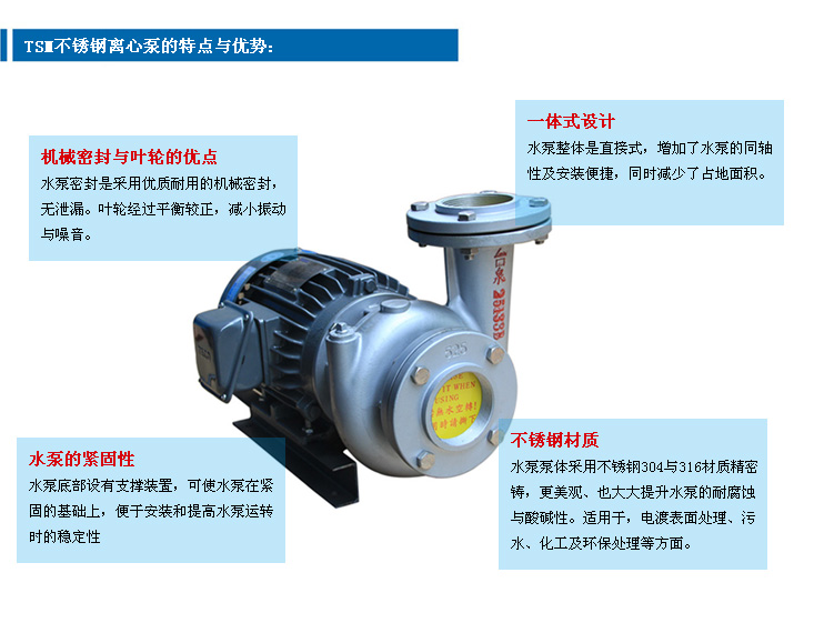 臺泉不銹鋼離心泵,泵體采用304、316精密鑄造成型,無砂孔問題。電機與泵體是一體形同軸設計,不僅僅保障了電機的穩固性,而且水泵占地面積小與噪音小的性能。水泵廣泛使用于電渡、涂裝、化工、PCB線路板、環保設備等方面。